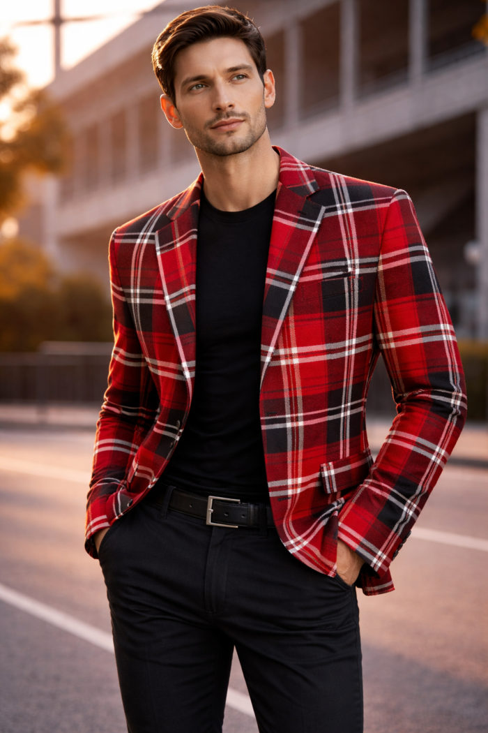 The Arkansas Heritage Plaid Blazer is designed for men who want their style to speak before they do. Inspired by classic collegiate aesthetics, this blazer features a striking crimson red base layered with clean white and black plaid lines, creating a look that feels both timeless and unmistakably powerful.