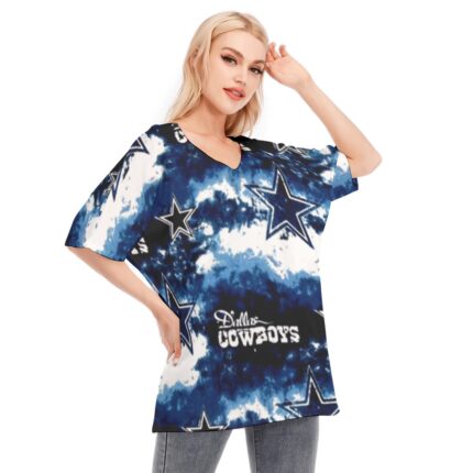 Dallas Cowboys Zubaz Dallas Cowboys Zubaz All-Over Print V-neck Women’s T-shirt With Bell Sleeve – Show your star pride with