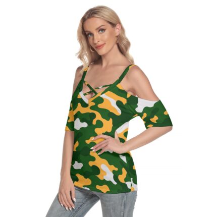 Support the Green Bay Packers in style with this premium Green Bay Packers All-Over Print Women's Cold Shoulder T-shirt With Criss Cross Strips.