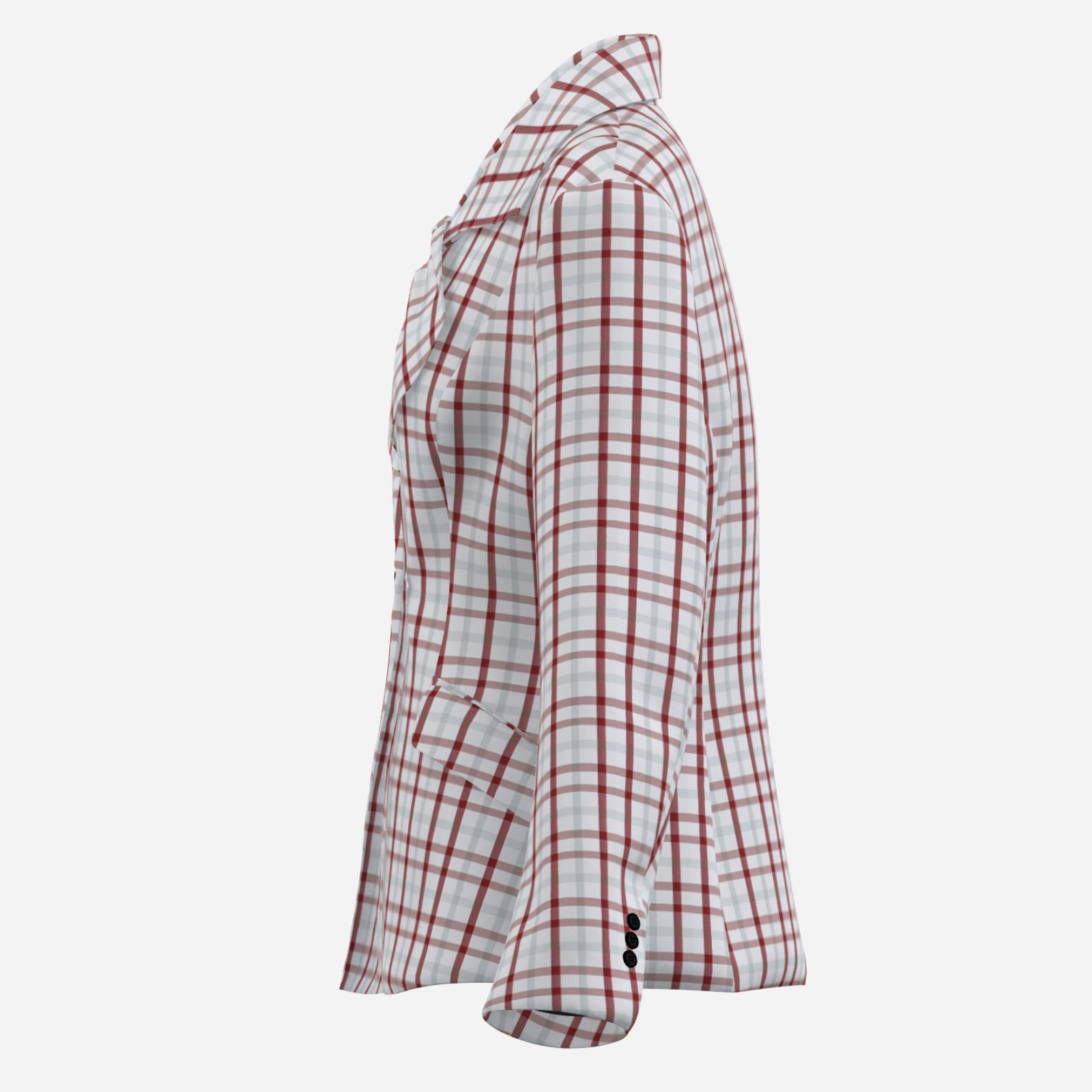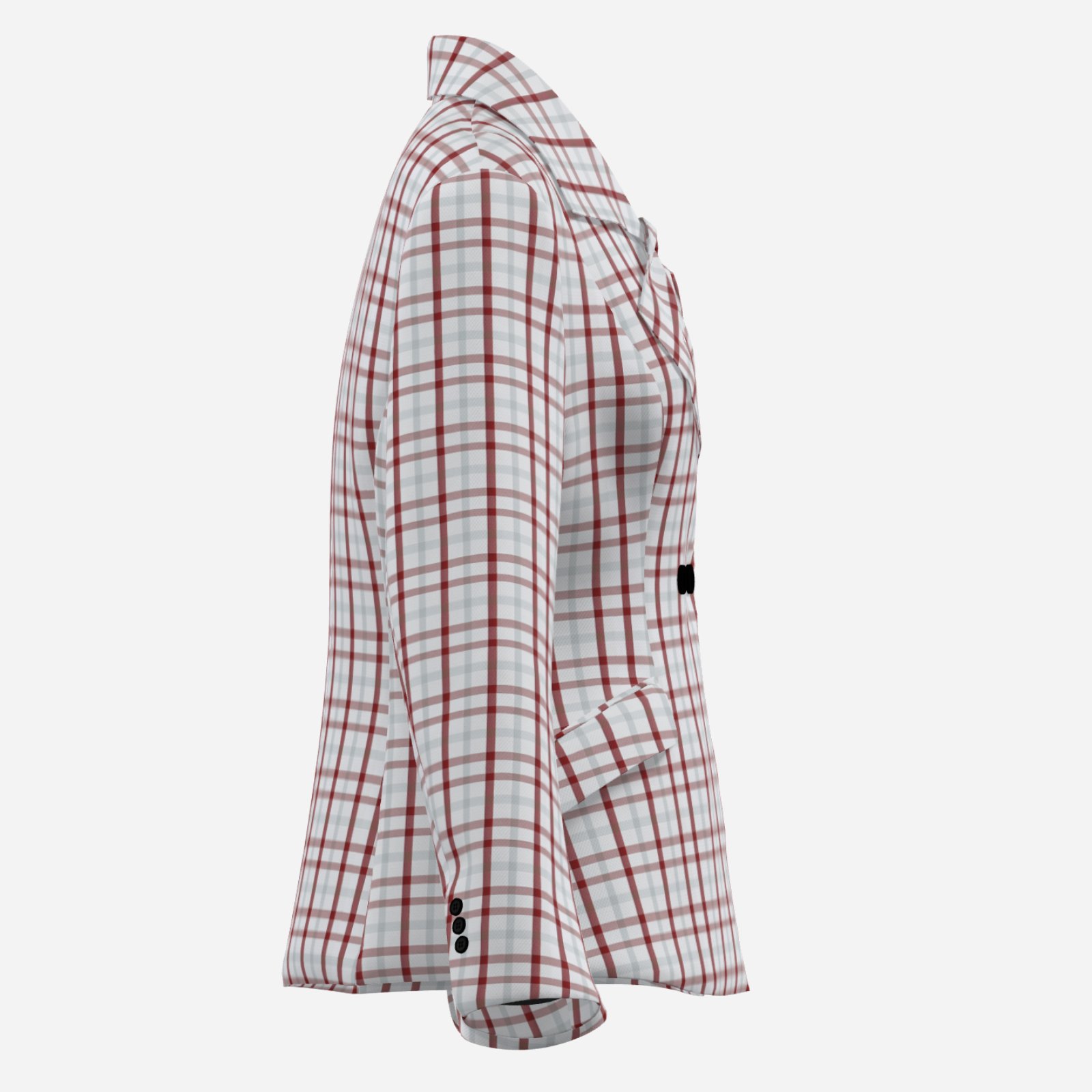 This Indiana Bloomington–inspired tartan plaid women’s blazer showcases a refined blend of crimson red and crisp white tones, delivering a timeless game day smart casual look designed for women who appreciate classic style with a bold collegiate influence.
