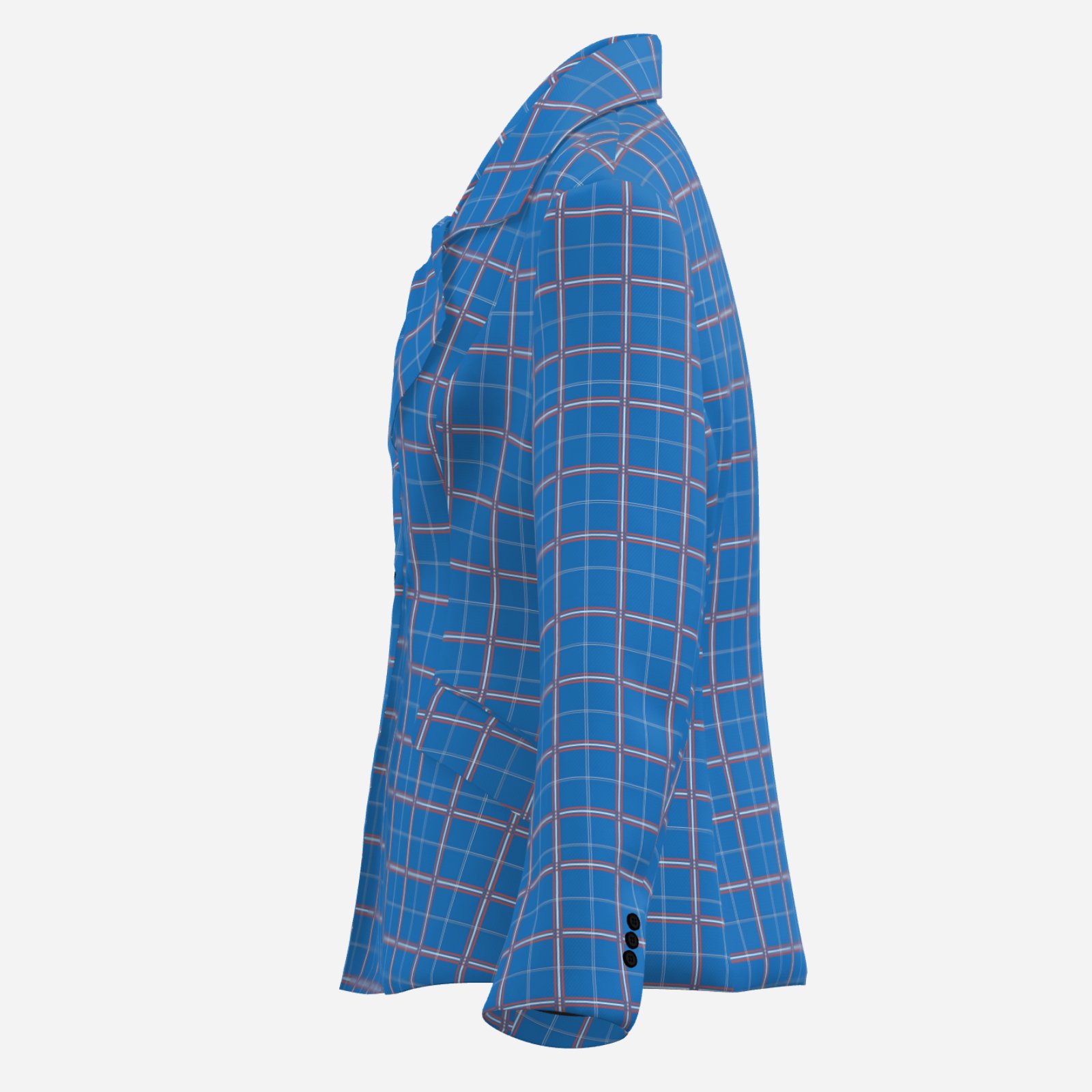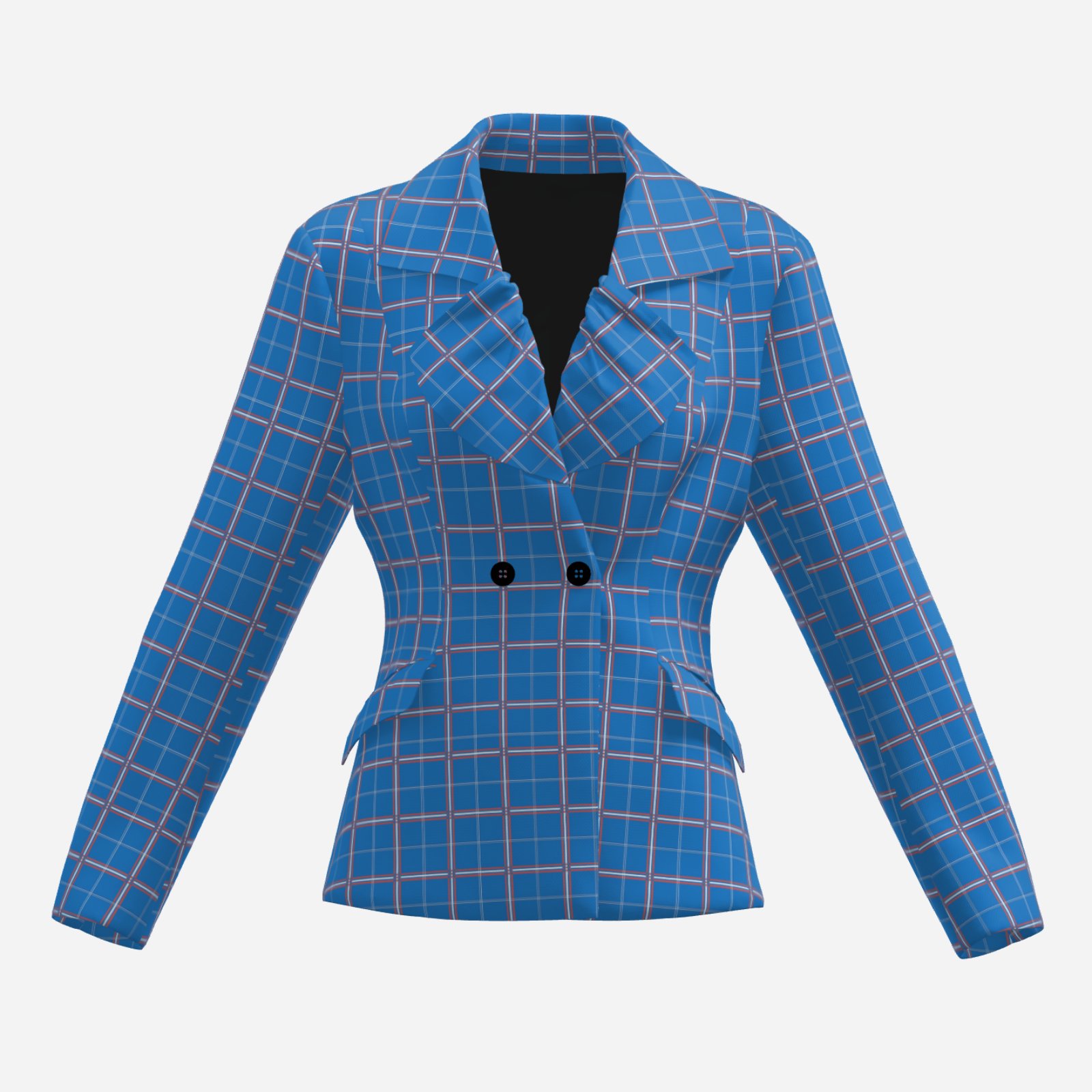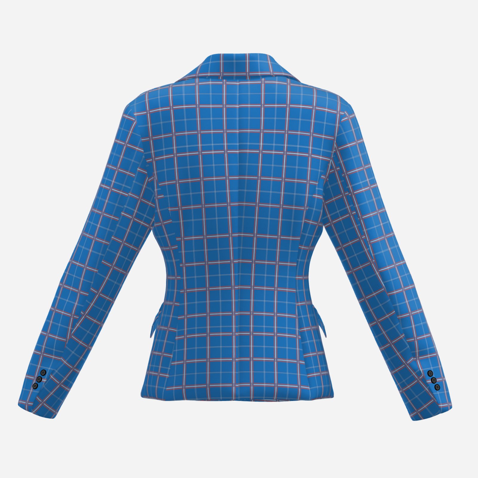 Featuring a refined blue base with red grid tartan accents, this blazer delivers a clean yet bold aesthetic that works seamlessly in city environments. The tailored double-breasted silhouette defines the waist and creates a polished shape that flatters a wide range of body types.