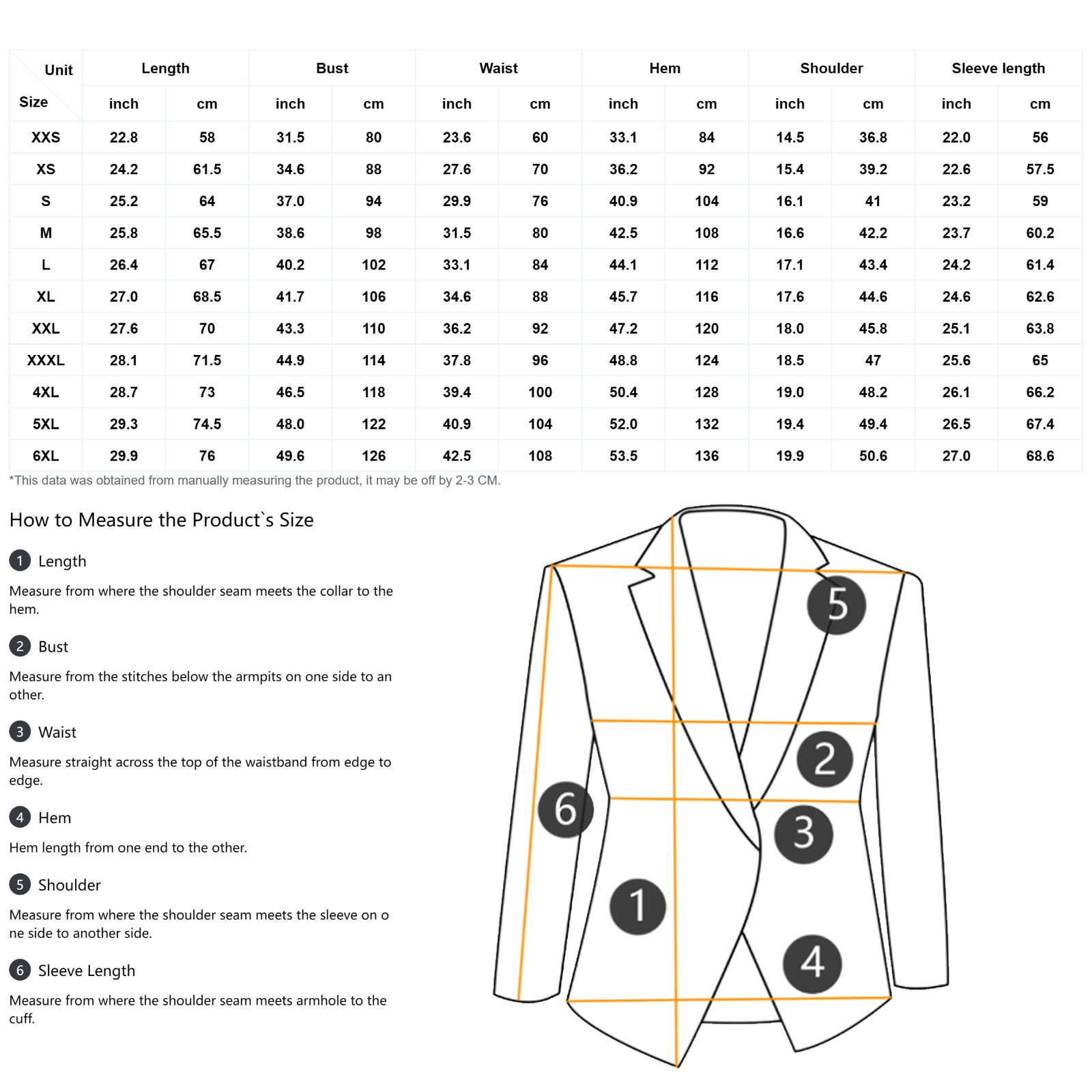 The measurement data of this size is obtained by laying clothes flat. Due to different measurement methods, it is normal that the error is within 2-3cm.