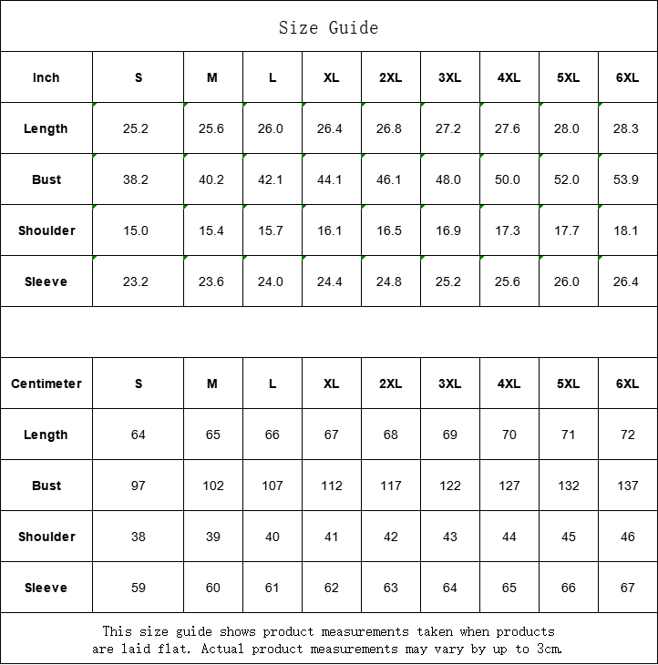 | Centimeter | S | M | L | XL | 2XL | 3XL | 4XL | 5XL | 6XL |