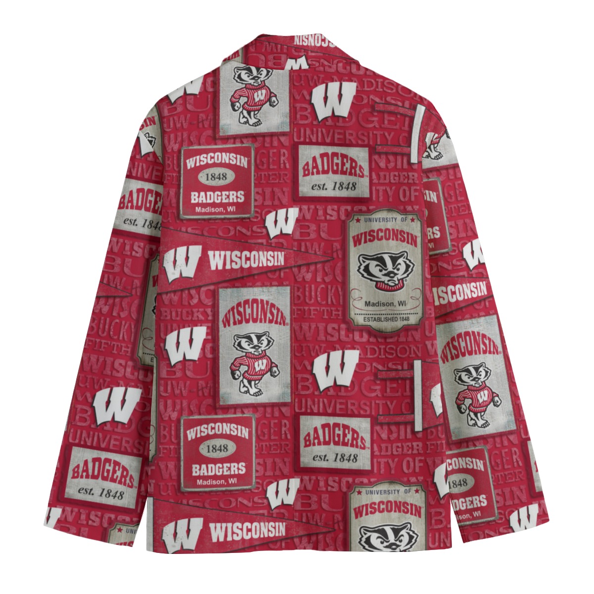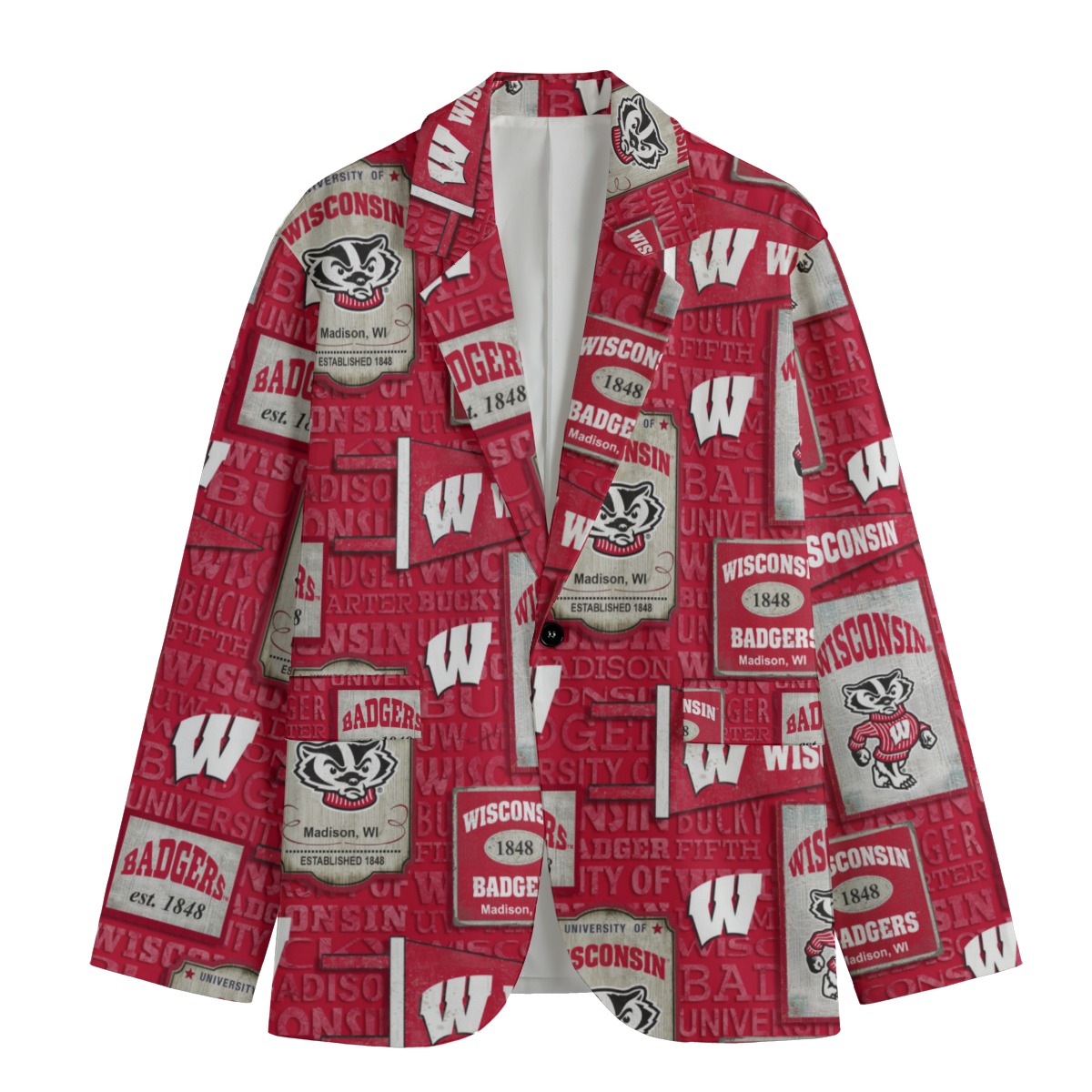 Crafted with a clean flat lapel collar and a relaxed yet structured silhouette, this blazer is ideal for game day outfits, campus life, alumni gatherings, and elevated streetwear looks. Its unisex design ensures a comfortable and flattering fit for both men and women, making it a must-have piece for Wisconsin fans.